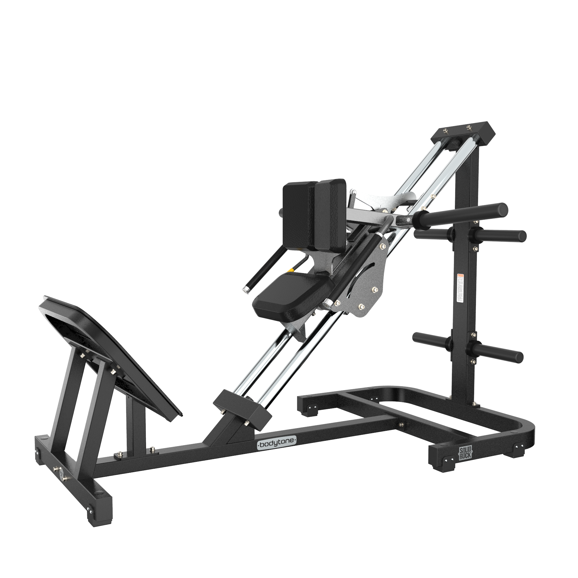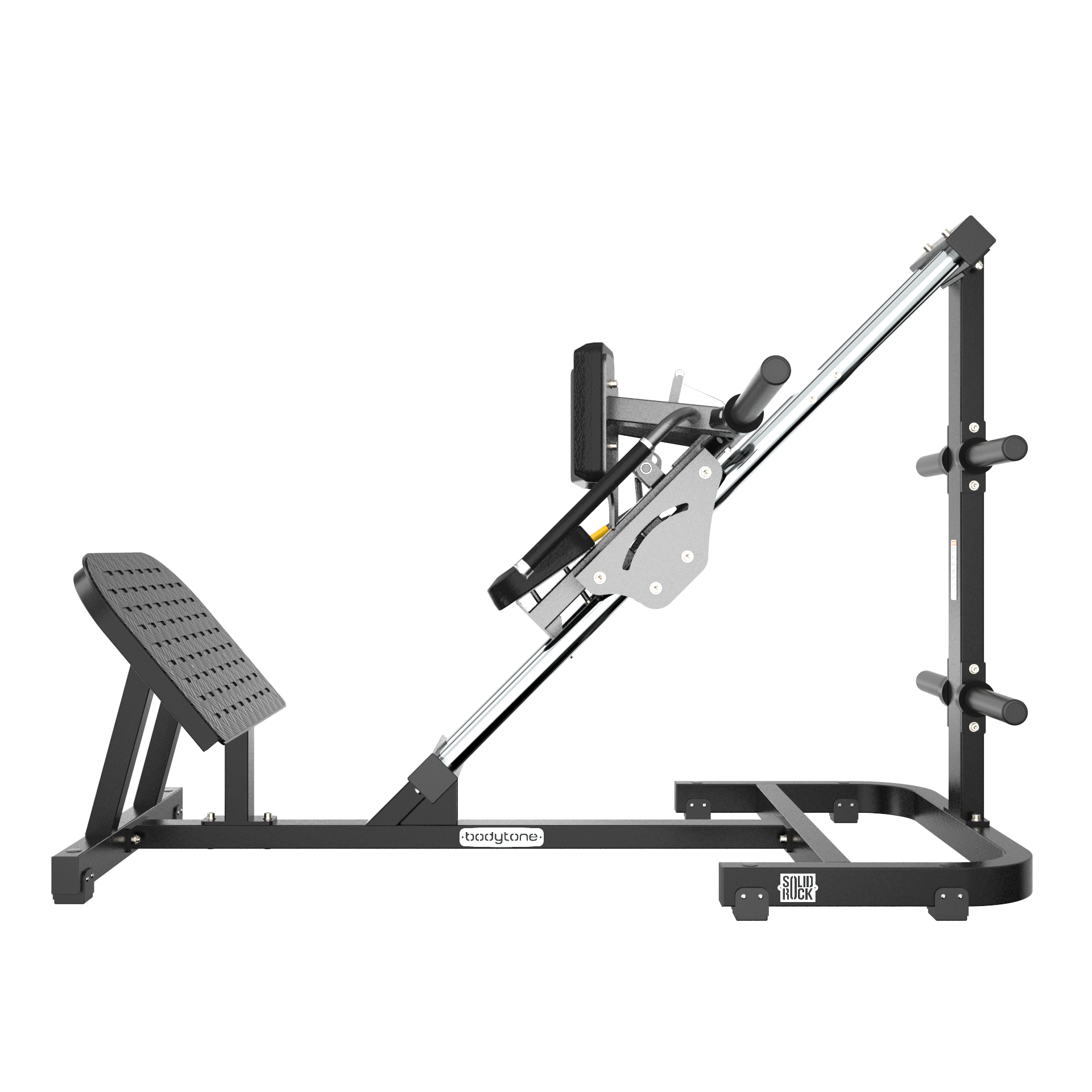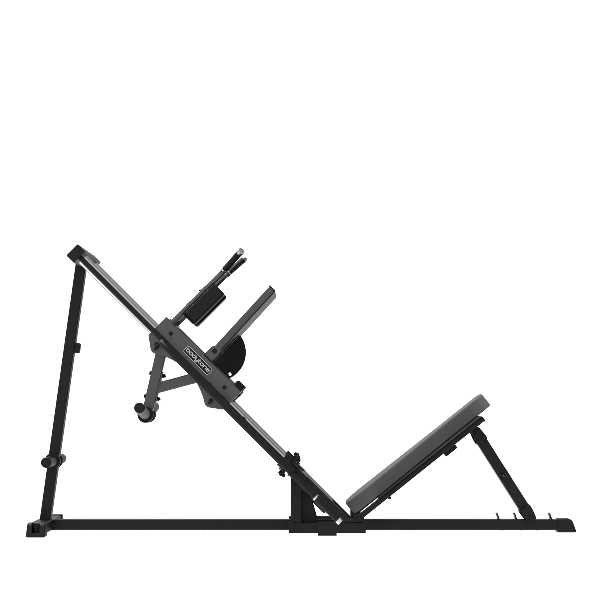 Prensa inclinada tipo hack para trabajo de piernas y glúteos. Tubo 100x50 mm y 75x50 mm, pletinas 8/10 mm. Ejes de acero inoxidable Ø50 mm. Carga máxima 300 kg. Tapizado Pebbled Leather.